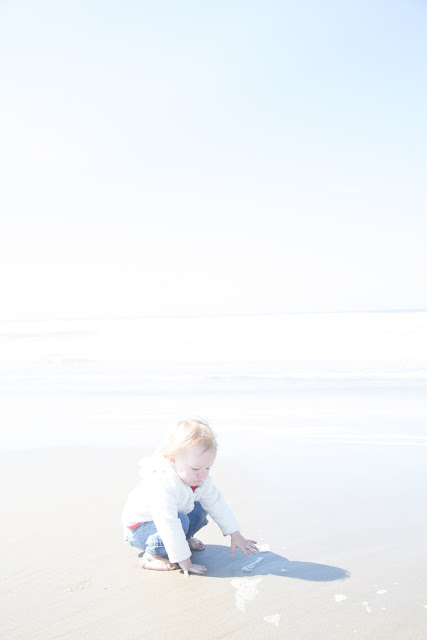 On the beach the salty ocean splashes her jeans, changing their color from periwinkle to deep navy. The water of the Pacific is bitingly cold here, making me wince as it touches the soles of my feet. But she doesn't seem to notice it like I do for she has the fortitude of youth and I have the comfortability of near middle age. With handfuls of wet sand and hair whipped by the coastal breeze she drives on through the receding tide. Frequently she stops, smiles up at me, points to the surf and chirps, "Mama!" as if confirming with me that I too am seeing the grandeur of the ocean with a novice's eyes. I scoop her up and bury my face in her hair, breathing in the faint scent of apples intermingled with the slightly bitter odor of salted earth.