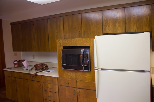 First step, other than to remove the upper cabinets and get a range hood, is going to be painting the cabinets. The cabinets are in really good shape despite their age and the truth is that even if Leif and I were to gut the entire thing I doubt we'd be able to afford new cabinets made from the same quality wood as these custom ones are. They are actually quite pretty in their own way and I would probably consider keeping them as they are in the right setting but in this house there is just too much wood everywhere. Wood paneling, wood flooring, and wood trim that along with the wood cabinets the whole thing feels a little too cabin-in-the-woods for me. So they are getting painted. White uppers and gray lowers. I know it is a bit on trend right now, which I always tend to avoid, but I figure in five years we may end up renovating and so it won't matter much.